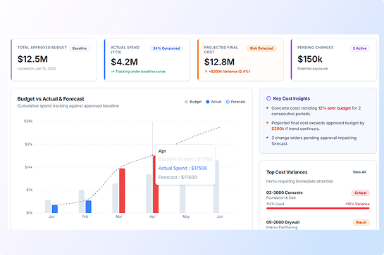 - Compare labour and material costs against approved budgets in real time
